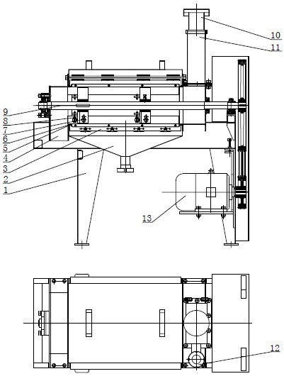 8、調整螺釘  9、傳動軸  10、透氣蓋  11、進料箱  12、進料口  13、傳動電機