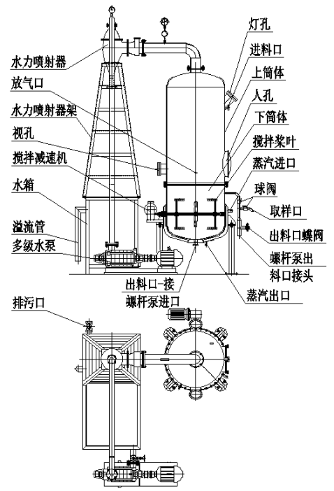 該設備為單效間息式真空濃縮設備,適用於熱敏性物料(如果醬、果漿等流動性較差的物料)在真空低溫條件下帶攪拌濃縮,達到濃縮果裝、果醬的效果。