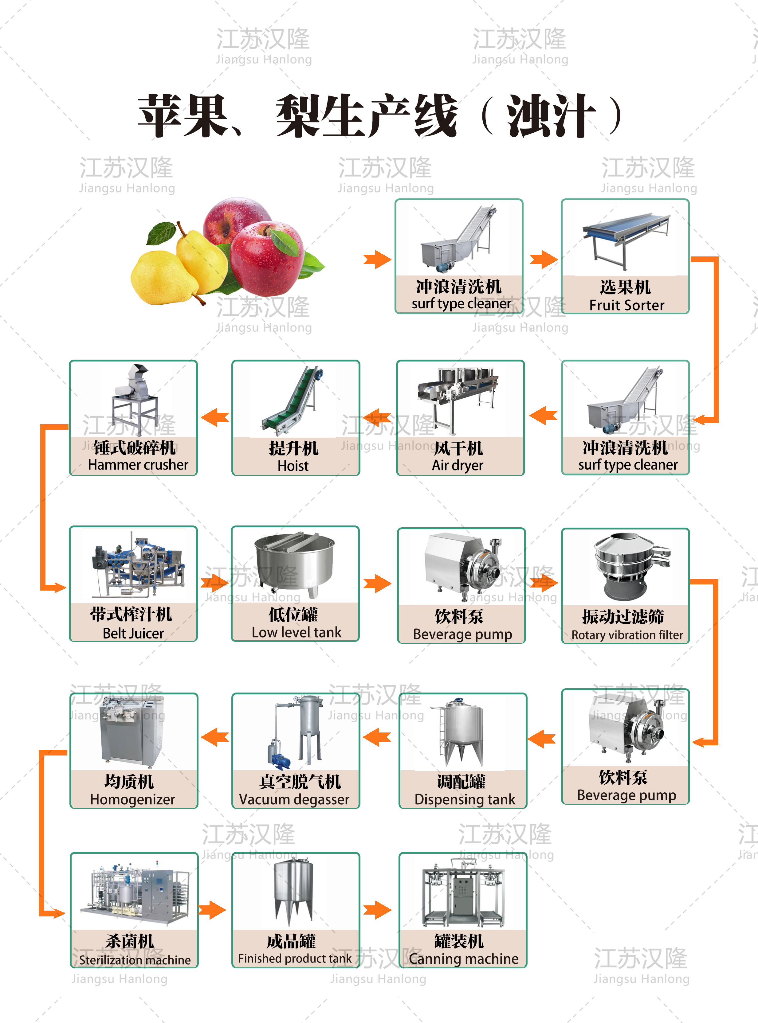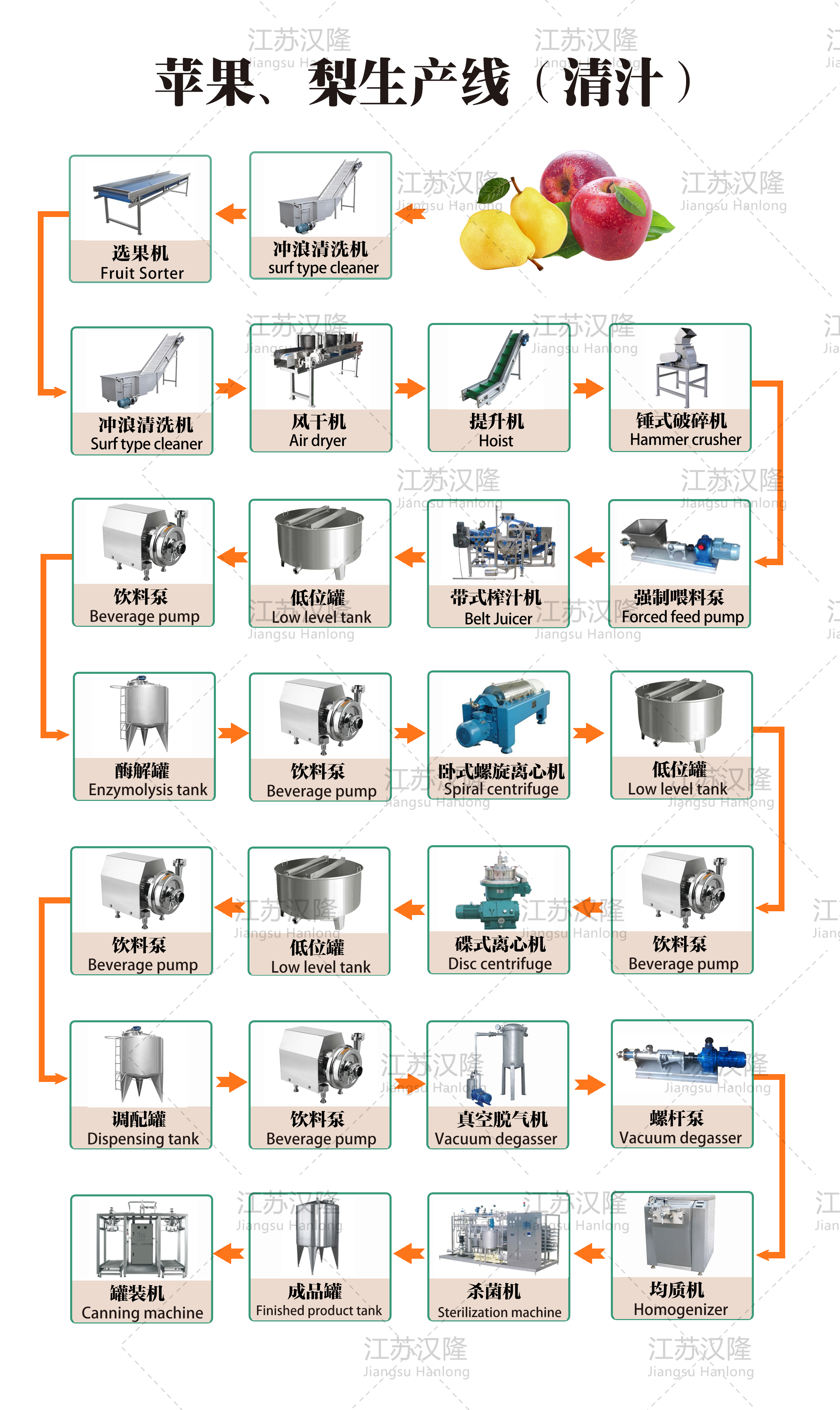 5、澄清和精濾。方法是將榨取的蘋果汁加熱至82--85℃,再迅速冷卻,促使膠體凝聚,達到果汁澄清的目的。也可以用膠、單寧、皂土、液體濃縮酶、幹型酶製劑等進行處理。澄清處理後的蘋果汁,采用需要添加助濾劑的過濾器進行過濾。用矽藻土作濾層的還可除去蘋果中的土腥味。