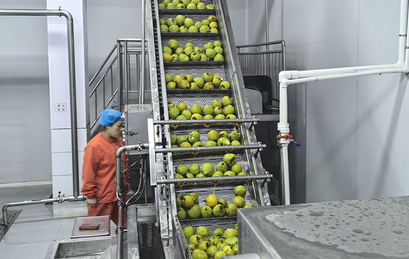 2、清洗和分選。把挑選出來的果實放在流水槽中衝洗。如表皮有殘留農藥,則用0.5%-1%的稀鹽酸或0.1-0.2%的洗滌劑浸洗,然後再用清水強力噴淋衝洗。清洗的同時進行分選和清除爛果。