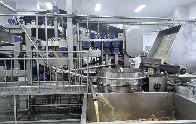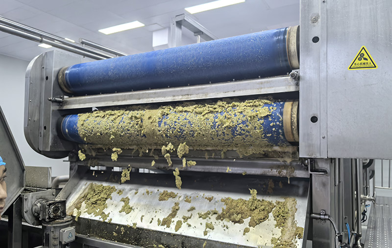 4、壓榨和粗濾。常用壓榨法和離心分離法榨汁。用孔徑0.5毫米的篩網進行粗濾,使不溶性固形物含量下降到20%以下。