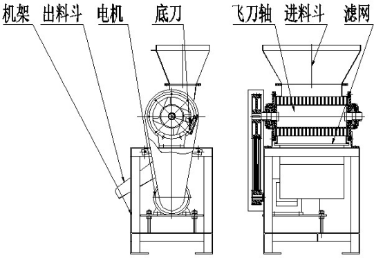 該機主要由機架、出料鬥、電機、底刀、飛刀軸、進料鬥、濾網等重要部分組成。