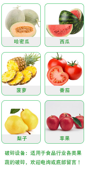 該機適用於漿果、仁果類果蔬的破碎,同時也能對預煮軟化過的仁果類的果蔬進行破碎,破碎粒度為5-8cm。