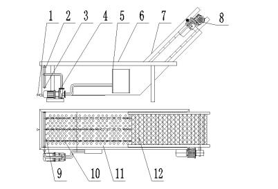 1、排汙閥    2、衝洗總管    3、水泡總管    4、循環水泵  5、水過濾箱    6、水箱    7、提升機架    8、調速減速機   9、衝洗噴嘴    10、水泡支管    11、防沉網    12、提升網帶