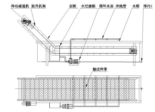 該機由水箱、提升機、循環衝洗水泵、傳動部分等部件組成,工作時物料直接被倒在輸送鏈板上,在水箱中輸送;而又由於輸送網帶上部設有衝洗管,使物料水的衝擊下產生翻滾,從而清洗物料。水箱內的水經過水過濾箱過濾後,由循環水泵通向衝洗管。本機也可根據用戶要求在提升段和水箱上部加設噴淋管。
