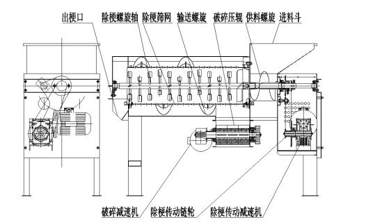 葡萄由進料鬥通過供料螺旋定量進入除梗轉篩內,由於除梗軸的旋轉作用,除梗軸上的葉片將葡萄果粒與果梗打散分離。除梗葉片成螺旋狀安裝在主軸上,並高速旋轉將梗枝由轉篩未端排出機外。除梗後的果粒從轉篩上的圓孔落入下部破碎裝置中,果粒經兩組破碎輥的旋轉擠壓作用破碎至工藝要求。破碎後的果漿落入下部的單螺杆輸漿泵內,輸送至下一工藝過程。