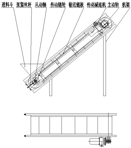 該提升機由機架、進料鬥、張緊絲杆、輸送鏈板、主動軸、從動軸、傳送鏈輪、傳動減速機等部件組成。