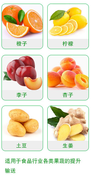 果品送入本機的進料鬥中,由主動棍帶動輸送皮帶,將果品輸送並提升至下道工序。該機機架為全不鏽鋼材料製造,可根據用戶要求采用多種型 材製造,也可增加噴淋管和集水槽等裝置。