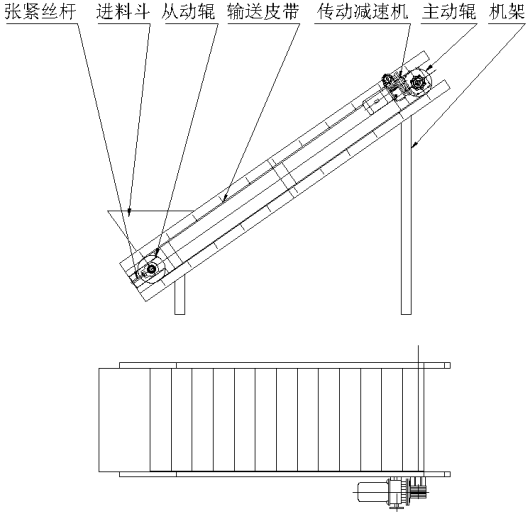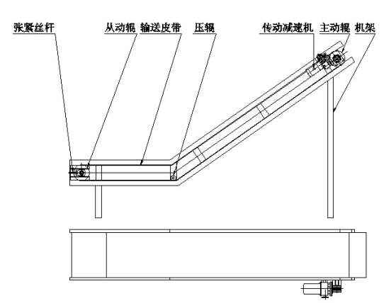 示意圖②:該提升機主要由機架、進料鬥、張緊絲杆、輸送皮帶、主動輥、從動輥、傳動減速機等部件組成。
