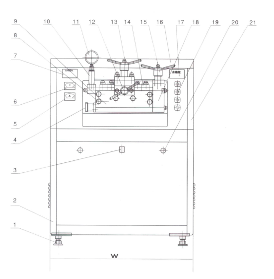 1.底腳    2.出水口   3.拉派    4.進料口    5.電流表    6.電壓表  7.銘牌   8.泵體螺母   9.泵體    10.傳壓缸    11.壓力表   12.高壓手槍    13.低壓手槍      14.壓蓋    15.溢流閥手槍    16.上蓋    17.標牌    18. 溢流閥體    19.電源開關     20.電器箱門鎖      21.外罩