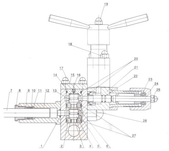 1.O型圈、密封墊圈    2.下閥座    3.導向杆      4.下閥門    5.下閥門彈簧    6.下花蘭   7.柱塞   8.緊定螺釘   9.壓環    10. 柱塞密封圈 (V型或方型 、隔離片)  11.定位套、墊環    12. 柱塞密封套    13.上閥門    14.上蘭花      15.壓板    16.上閥門彈簧      17.螺栓、螺母        18. 螺栓、螺母      19.加壓杆螺母     20.O型圈、密封圈    21.一ji均質閥體    22.均質杆、O型圈        23.平麵軸承        24.加壓杆    25.加壓杆螺母       26.泵體螺母    27.上、下閥門密封圈