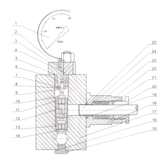 1.壓力表組件  2.表座密封墊  3.表座壓蓋  4.壓蓋  5.圓錐柱 6.壓蓋密封墊  7.緊鎖螺帽  8.調節螺帽  9.帶孔緊鎖螺帽    10.錐閥芯   11.上錐閥座   12.限位套   13. 下錐閥座     14.調整墊片  15.螺塞   16.O型橡膠密封圈    17.泵體      18.柱塞密封套  19.泵體平麵密封圈  20.緊定螺釘  21.壓環    22.柱塞密封圈 (V型或方型) 23.隔離片  24.座環  25.柱塞