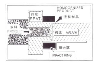 GJJ係列高壓均質機是一種超細粉碎,乳化勻漿設備,它利用高壓條件下的混懸液,通過一個可調節的限流縫隙過程中失壓、膨脹、爆炸、剪切和高速撞擊等綜合效應,將在液體中的顆粒和油滴粉碎成很小尺寸,直徑Ø0.1-2um,平均Ø≤1um,同時建立理想的乳化液或分散液。這個過程集超聲波粉碎機、膠體磨、球磨機、射流機等功能原理於一體(圖3)。產品的穩定性、一致性、混合性、易吸收性、營養值、保質期、口味、色彩和保活性都可在均質機得以實現。