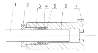1.螺栓   2.壓蓋   .3.椎孔V型密封組件(上端是座環,下端是壓環)  4.圓錐柱   5.鎖緊螺母  6.限位柱  7.上椎閥芯