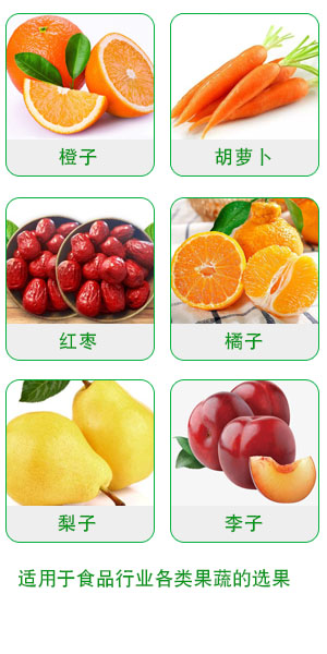 果品送入本機的進料鬥中,由主動棍帶動輸送皮帶,將果品輸送至下道工序。人工在機器的兩邊進行選果。該機機架為全不鏽鋼材料製造,可根據用戶要求采用多種型 材製造,也可增加噴淋管和集水槽等裝置。